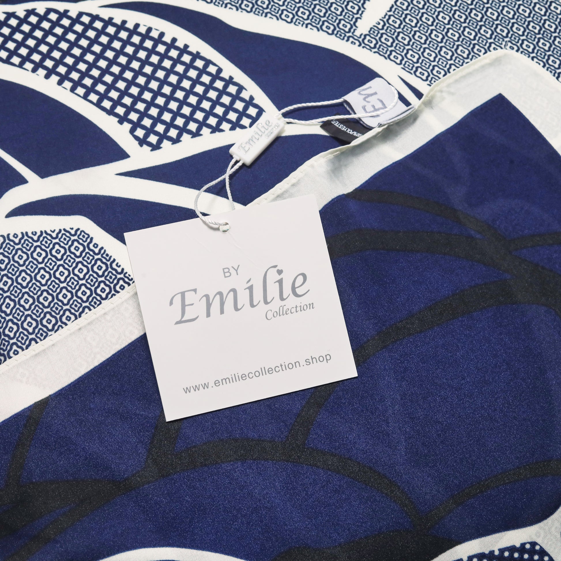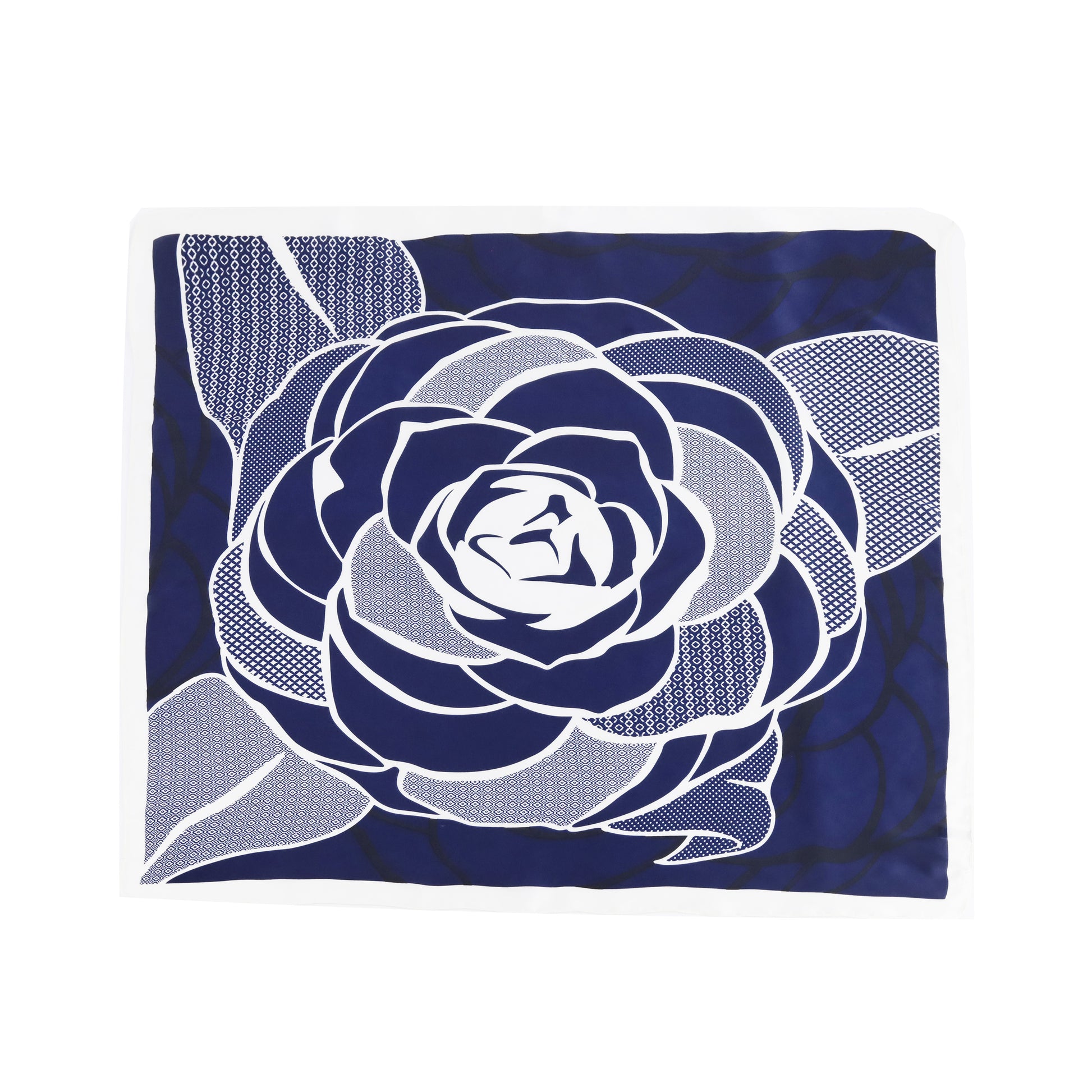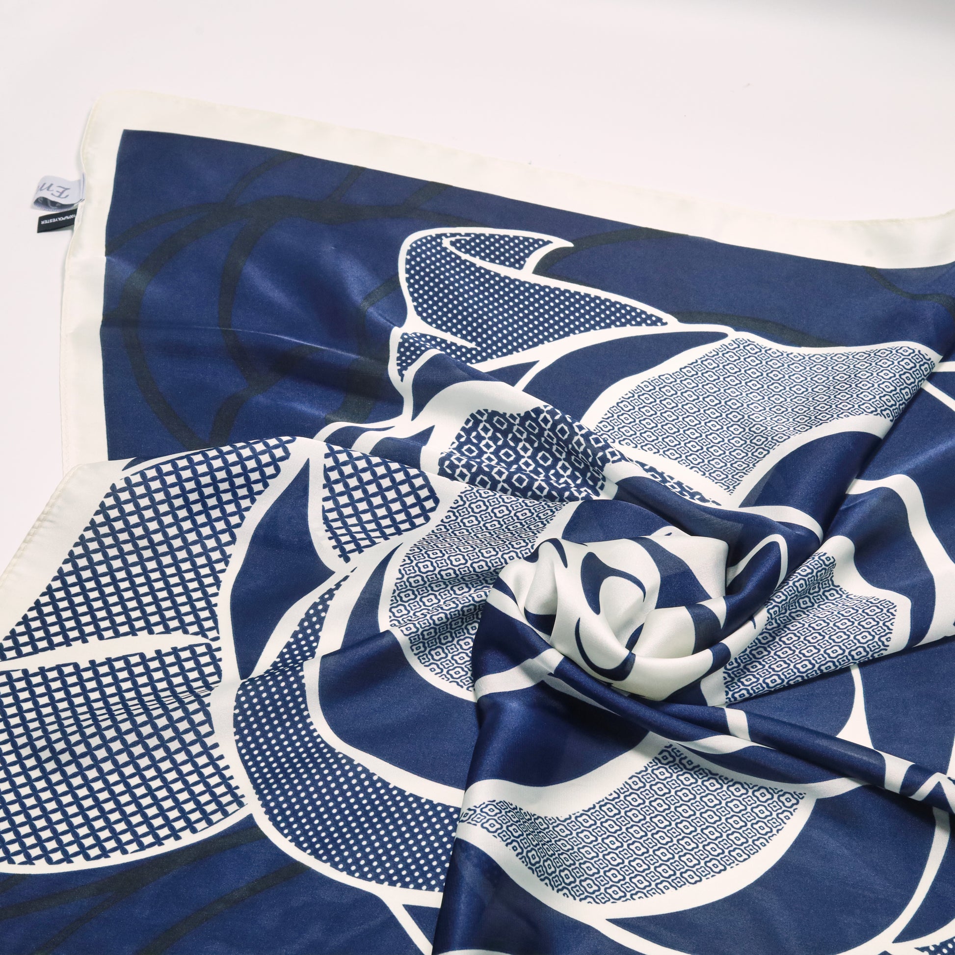 A modern and stylish satin scarf that immediately stands out with its graphic floral design. This design by Emilie Scarves combines a deep navy blue background with a large white floral print, giving the scarf a fresh and contemporary look. Minimalist, yet powerful.