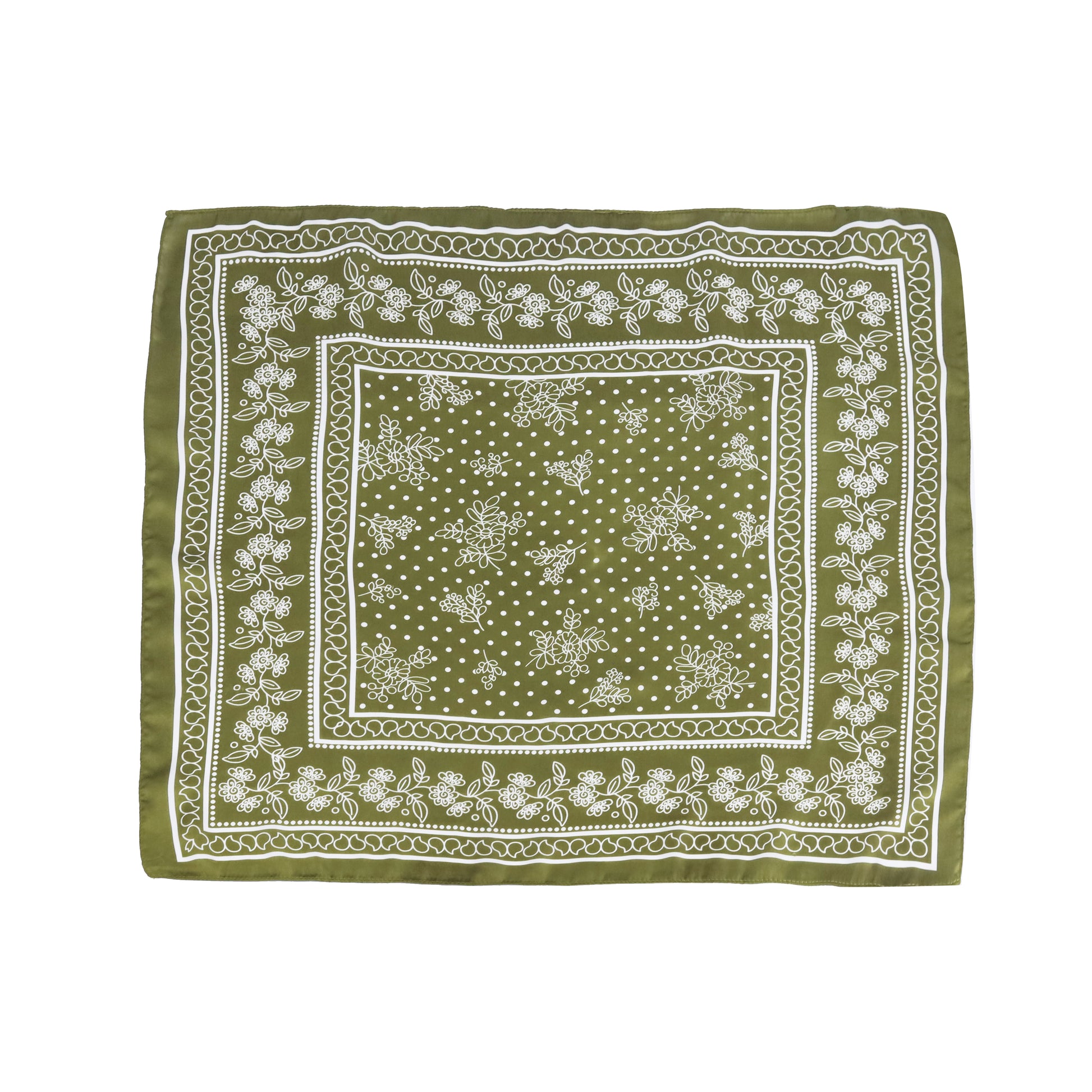 This satin scarf from Emilie Scarves has a fresh, modern look thanks to its olive green design with a delicate white floral print. The combination of a soft floral border, subtle polka dots, and a classic bandana-style pattern creates a timeless and versatile accessory that's effortless to style.