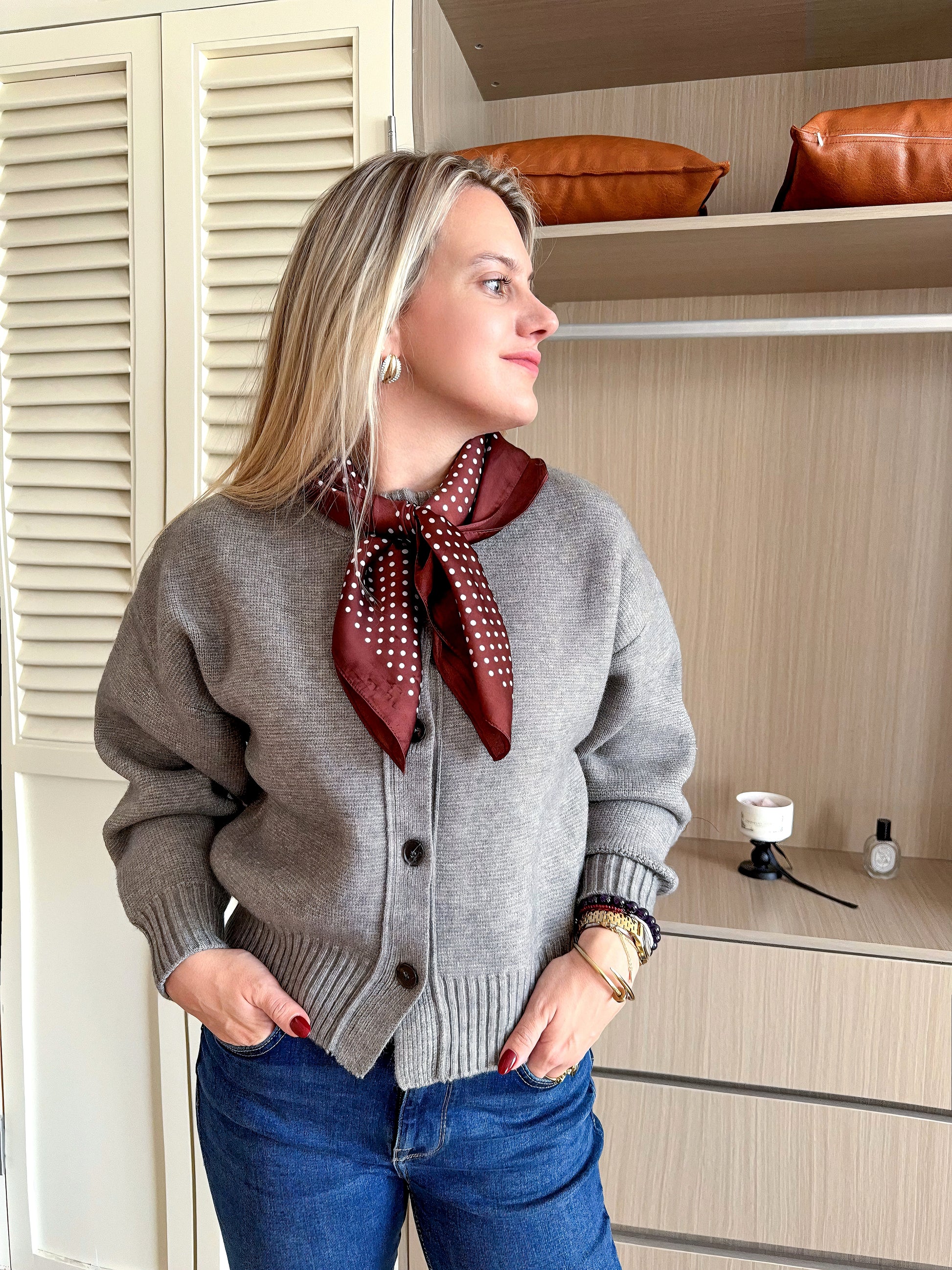 A stylish scarf that adds a feminine and refined touch to any outfit. This brown satin scarf with white polka dots from Emilie Scarves feels soft and has a subtle sheen that's perfect for any occasion.