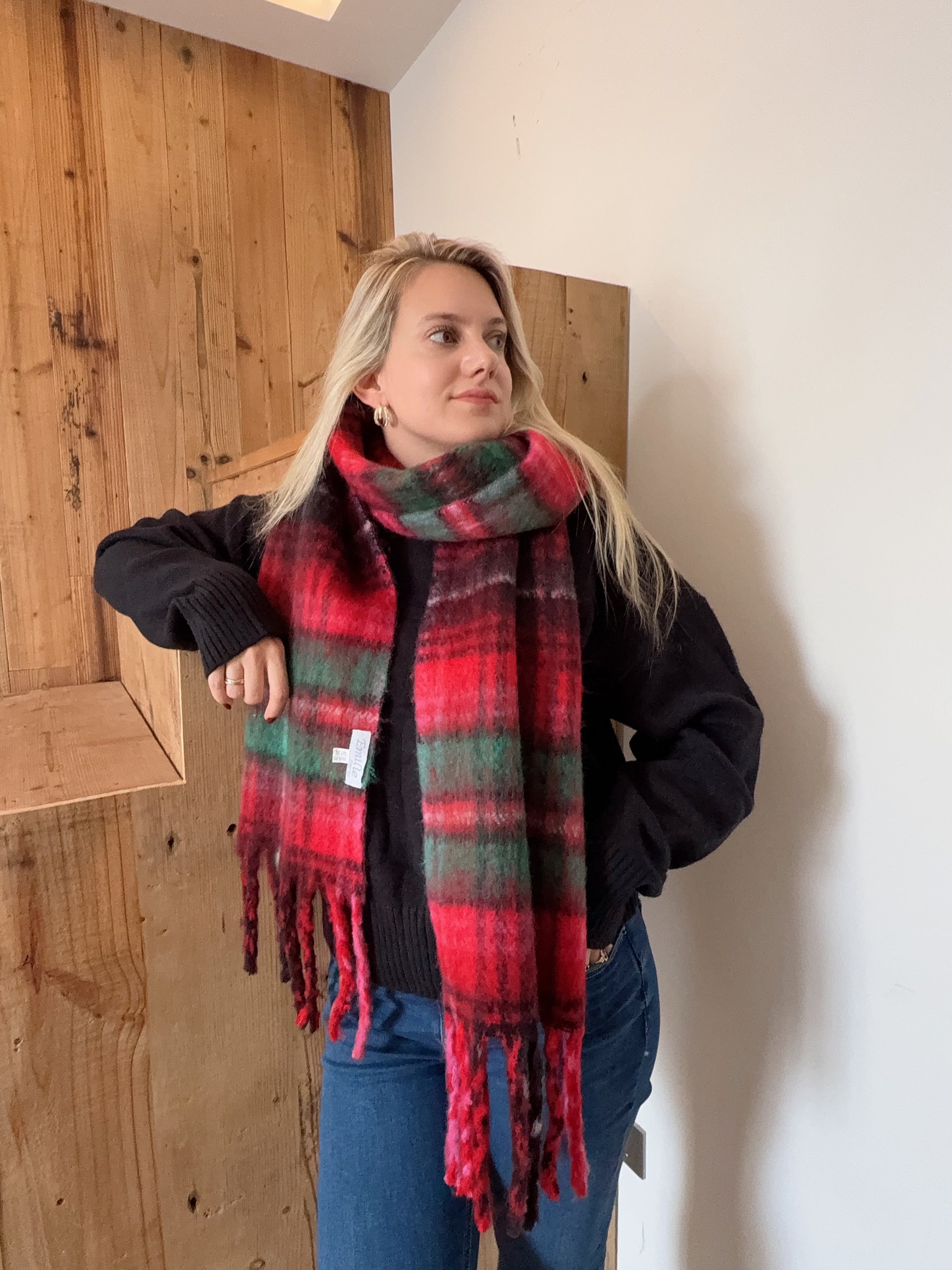 Super soft and warm winter scarf in a square design from Emilie Scarves. This winter scarf can be worn in various ways. It has a rugged look and is finished with fringed edges.