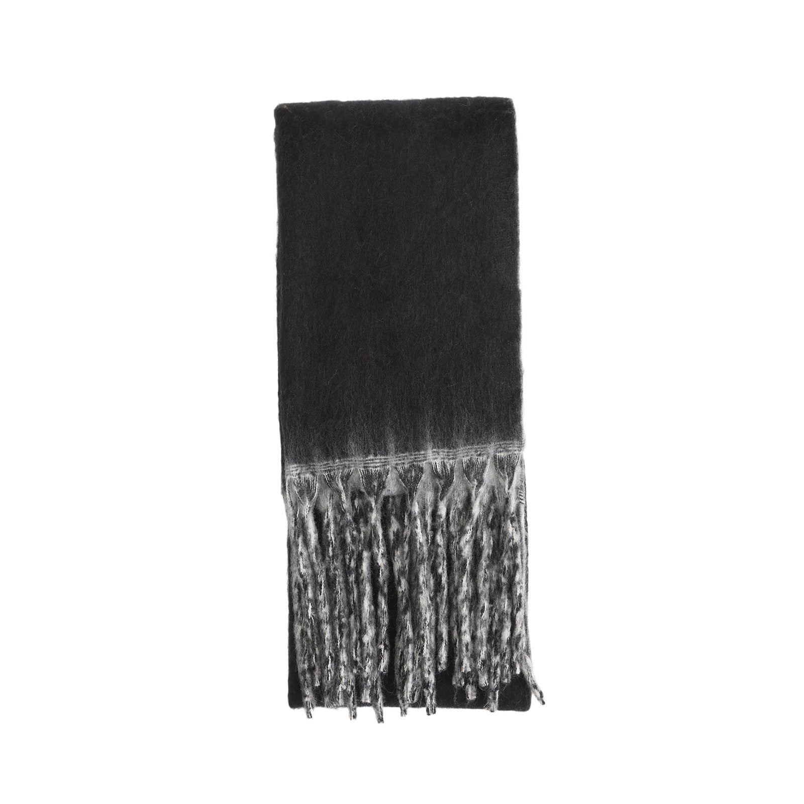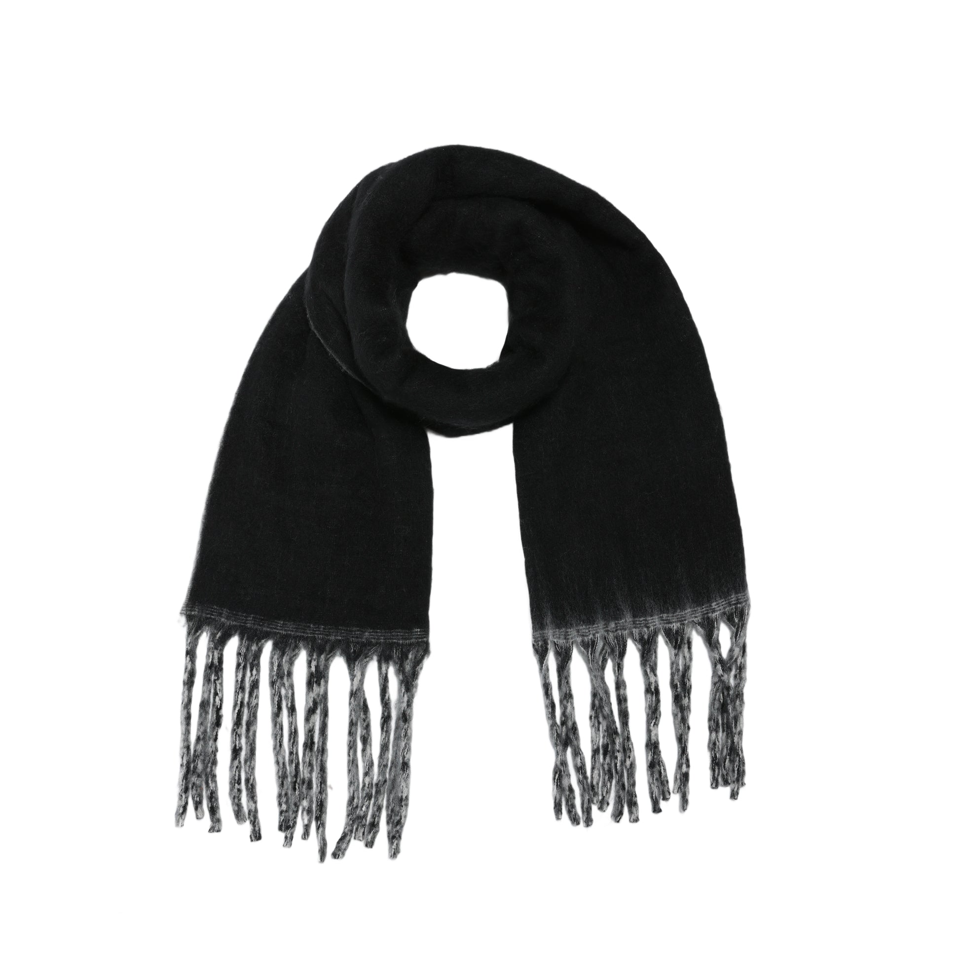 The scarf is two-tone, with each side a different color . This winter scarf can be worn in various ways. It has a rugged look and is finished with fringed edges.